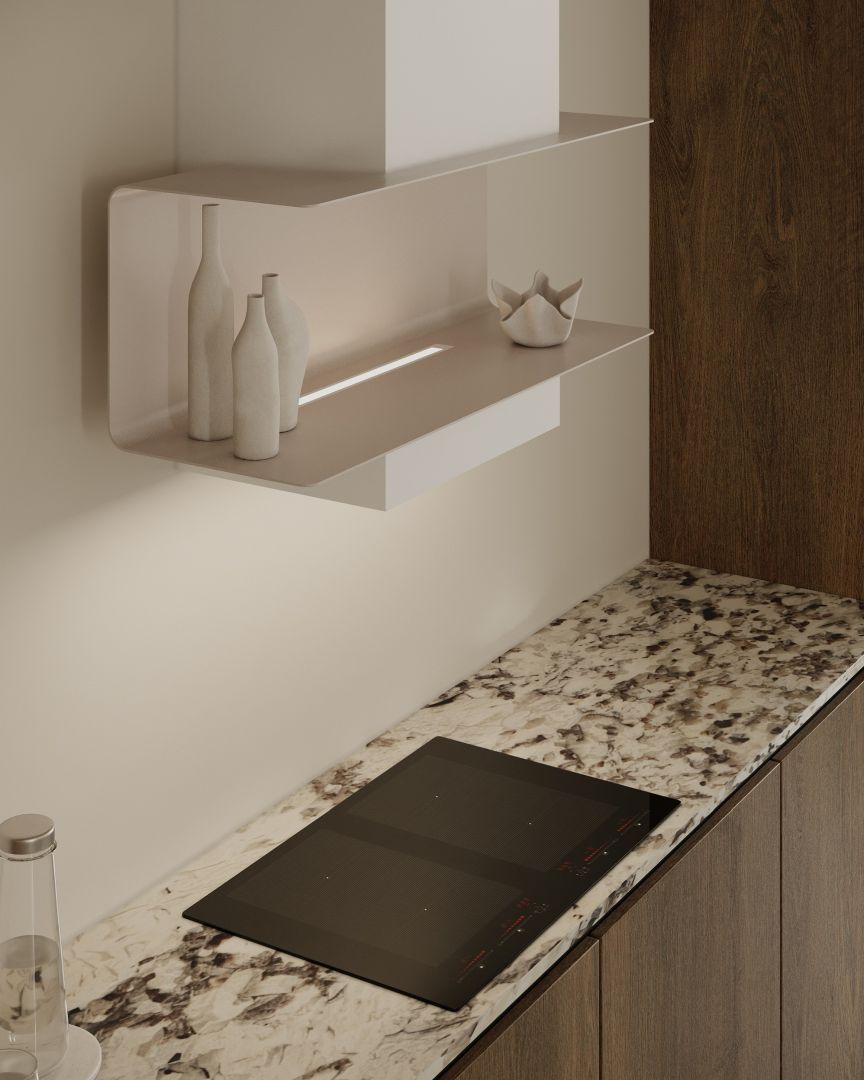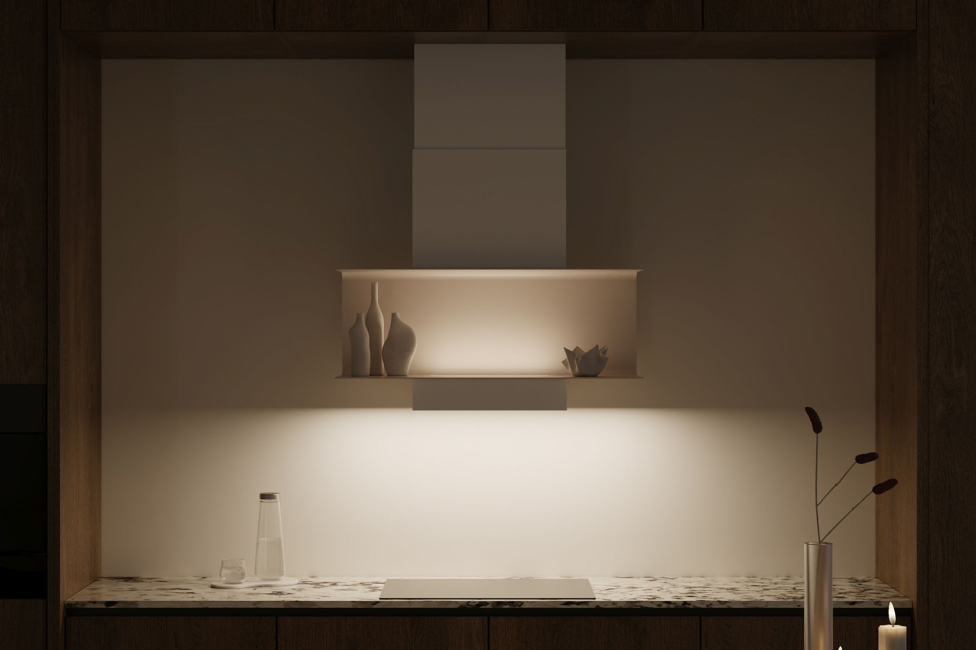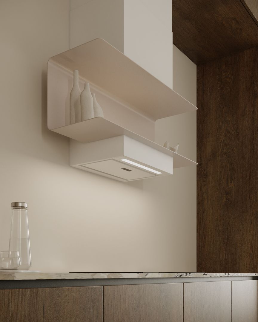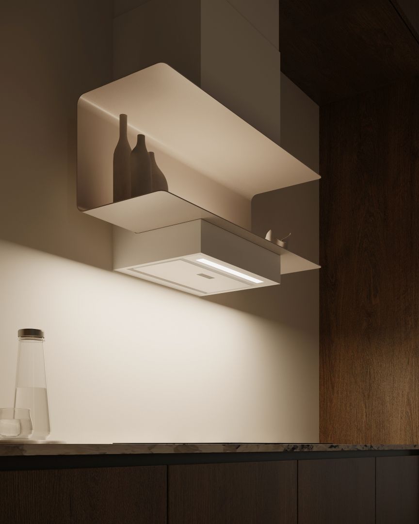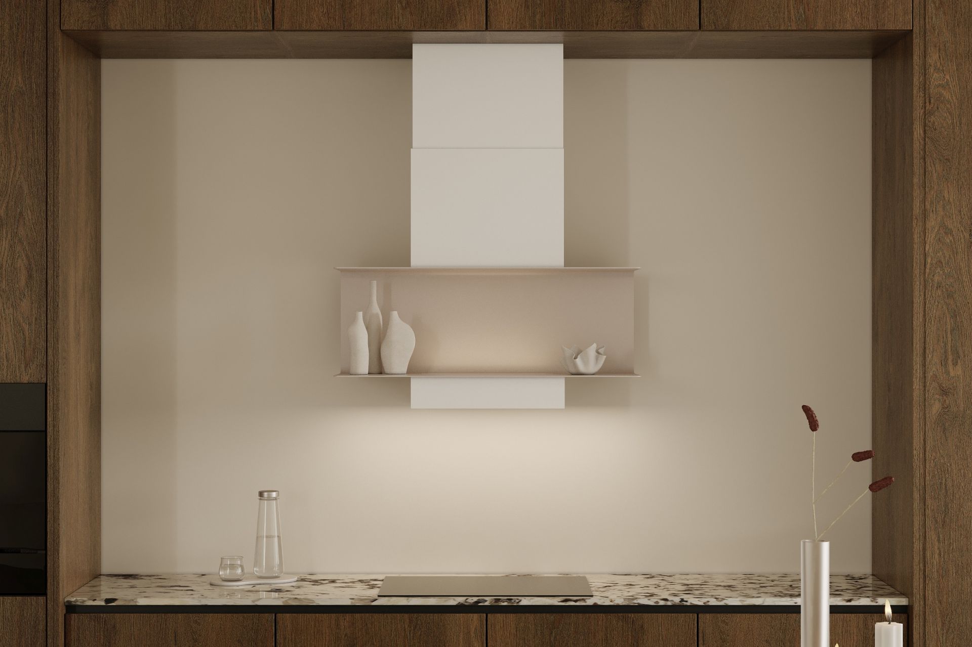 Zvolte C-Shelf White-Kashmir – dvoubarevnou nástěnnou digestoř s LED policí, která propojuje ticho, světlo a design.