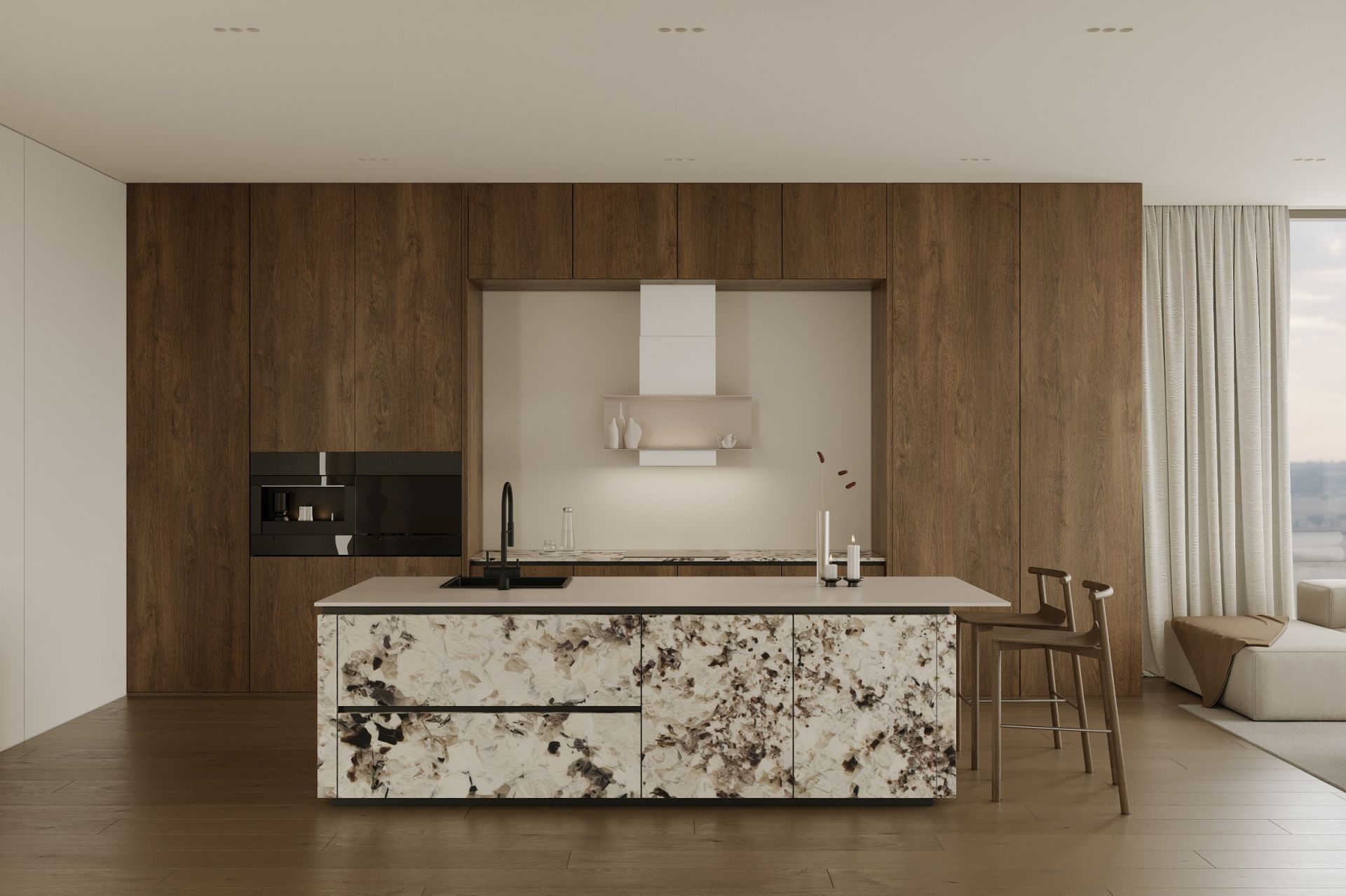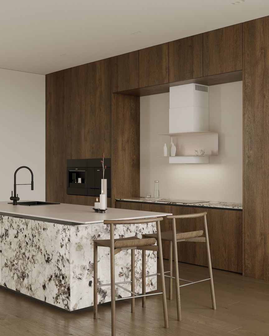 se světlými pracovními deskami, mramorem, dřevem a odstíny greige,