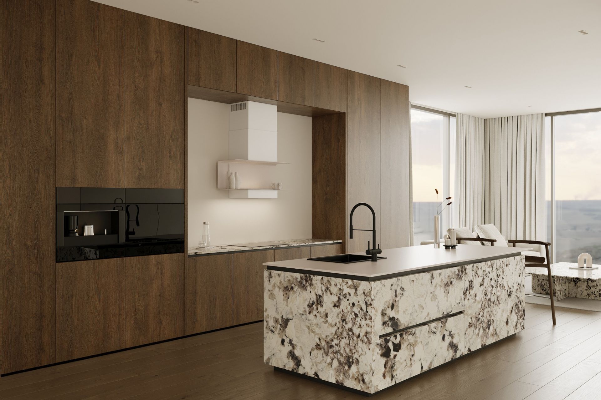 Skvěle ladí se světlým dřevem, mramorem, barvou greige a prvky ve zlaté nebo černé. Jedná se o nástěnnou digestoř s LED policí, která zaujme jemným kontrastem a precizním zpracováním.