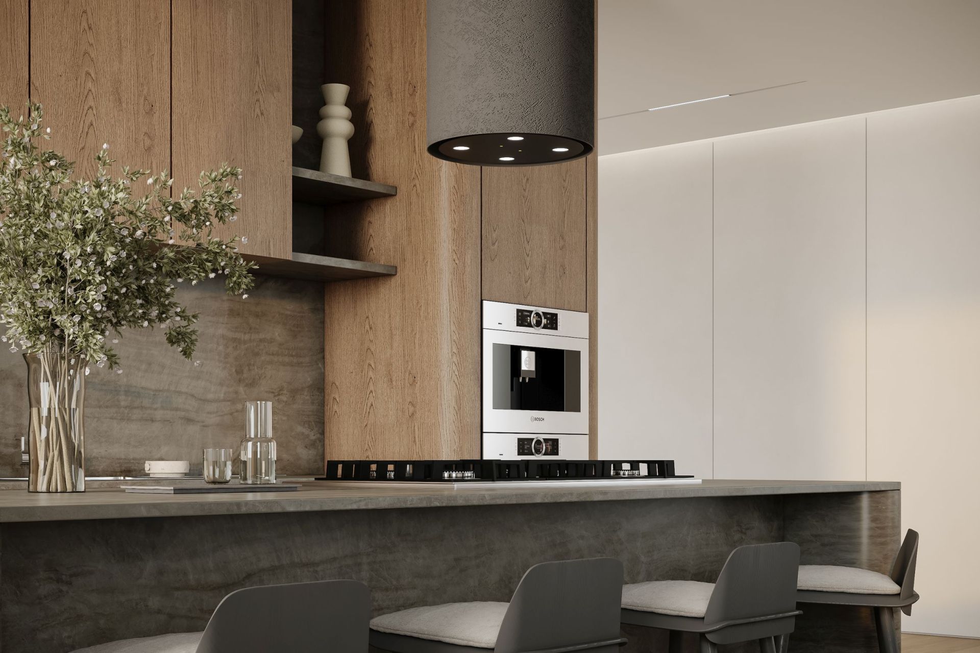 Digestoř Nortberg Columni Stono Dark Grey je designový kuchyňský prvek, který vyniká elegantním tvarem připomínajícím klasický sloup a povrchem v tmavě šedém odstínu, imitujícím surový architektonický beton. Dekorativní povrch je vyroben z inovativní směsi cementu, pryskyřic, vody a minerálních pigmentů, což produktu dodává mimořádnou odolnost a moderní charakter.