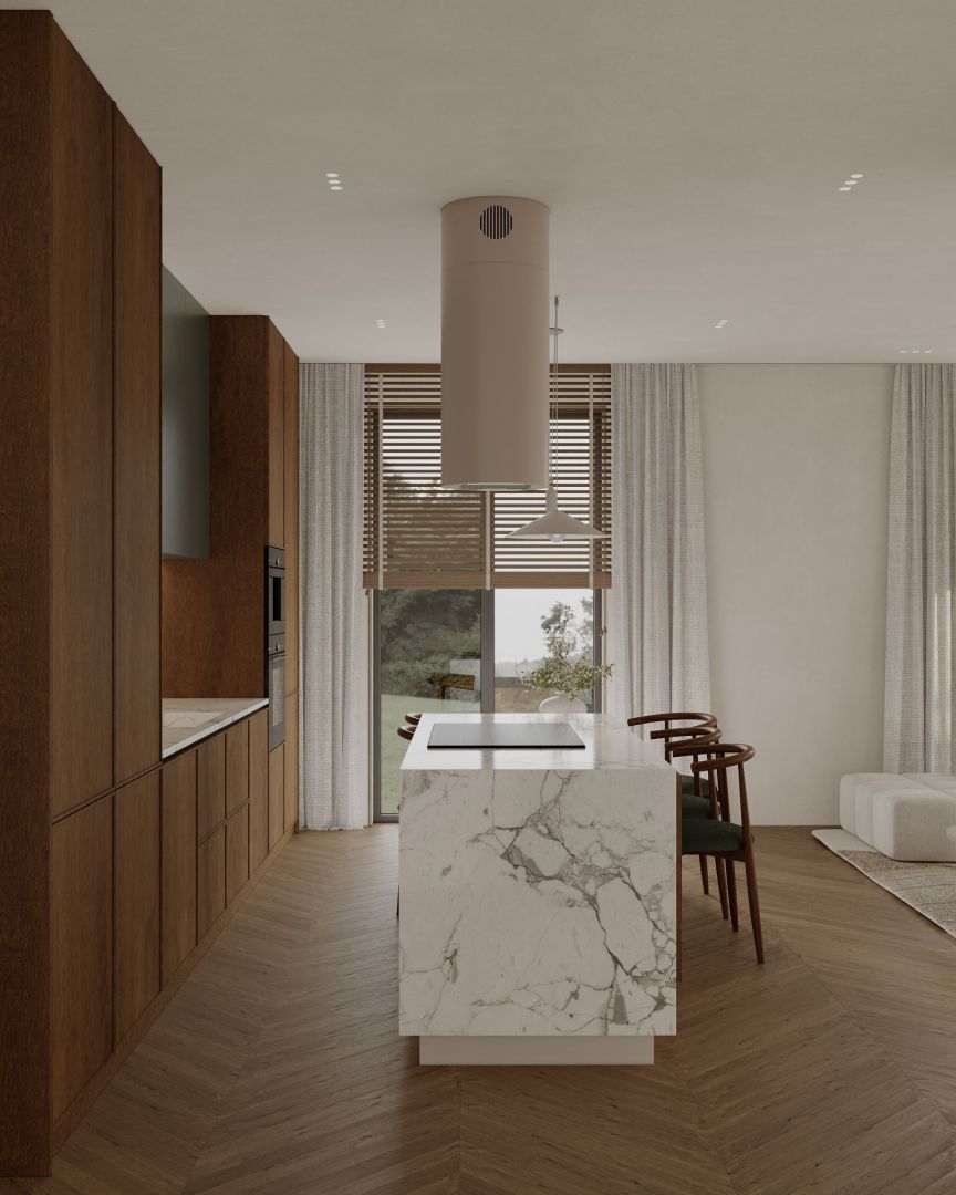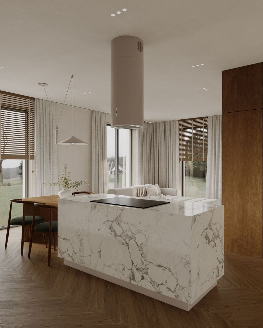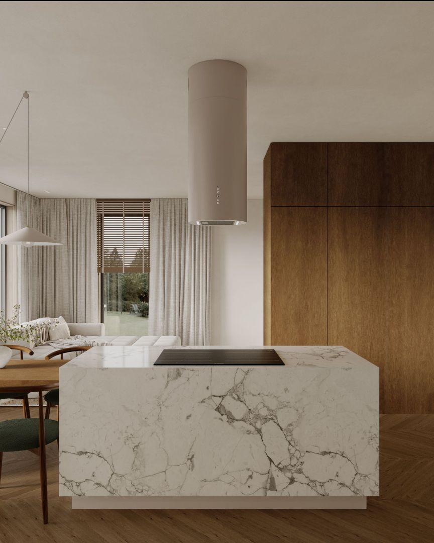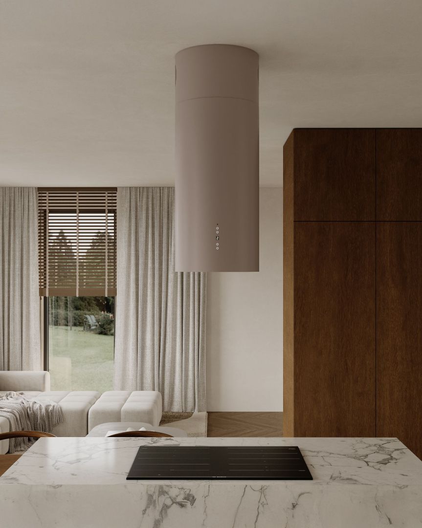 ,,Ostrůvková digestoř Cylindro 2Strips Kashmir přináší do kuchyně ticho a vizuální harmonii. Každý detail odráží řemeslné mistrovství značky Nortberg a dodává prostoru elegantní dojem."