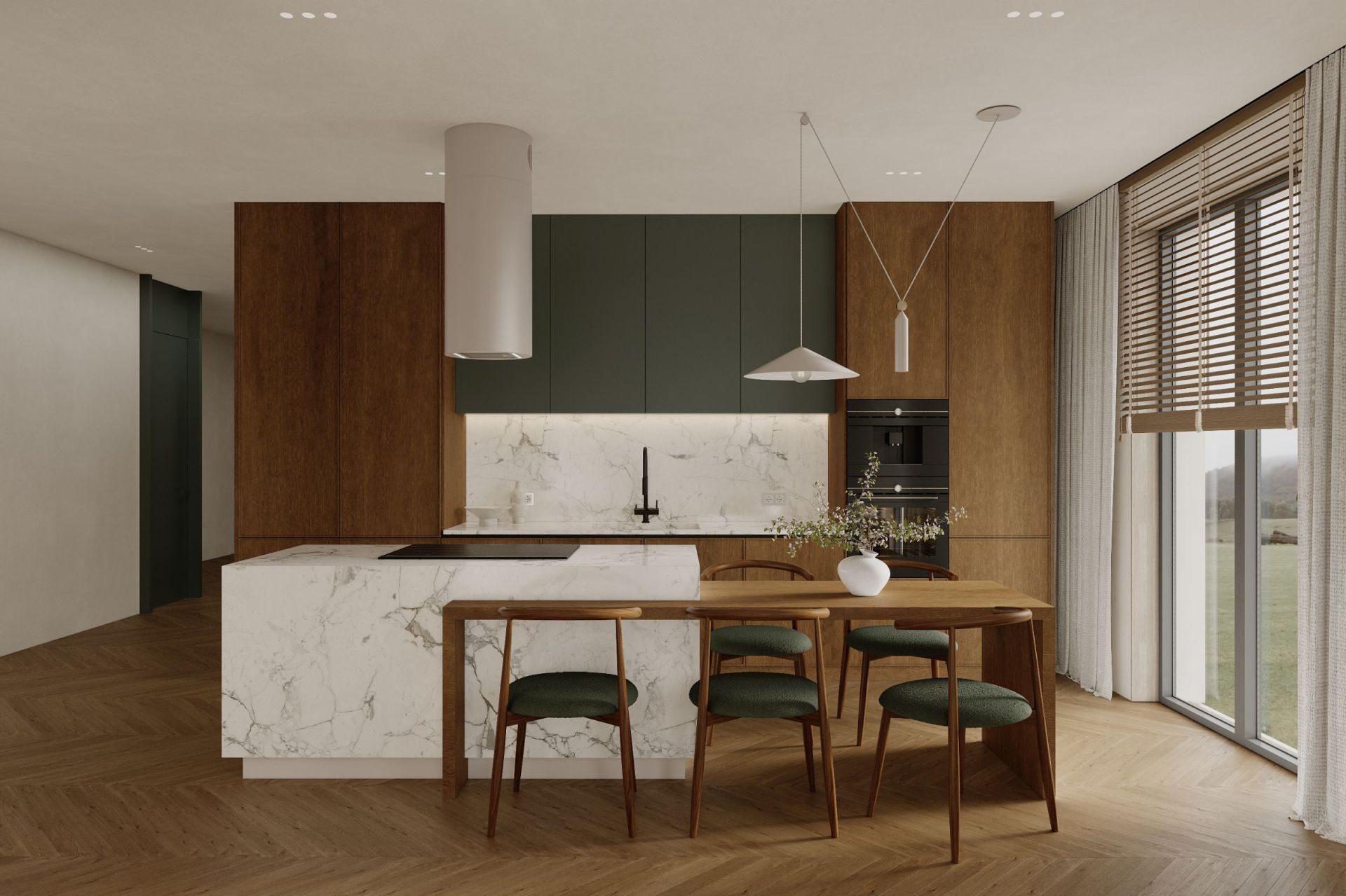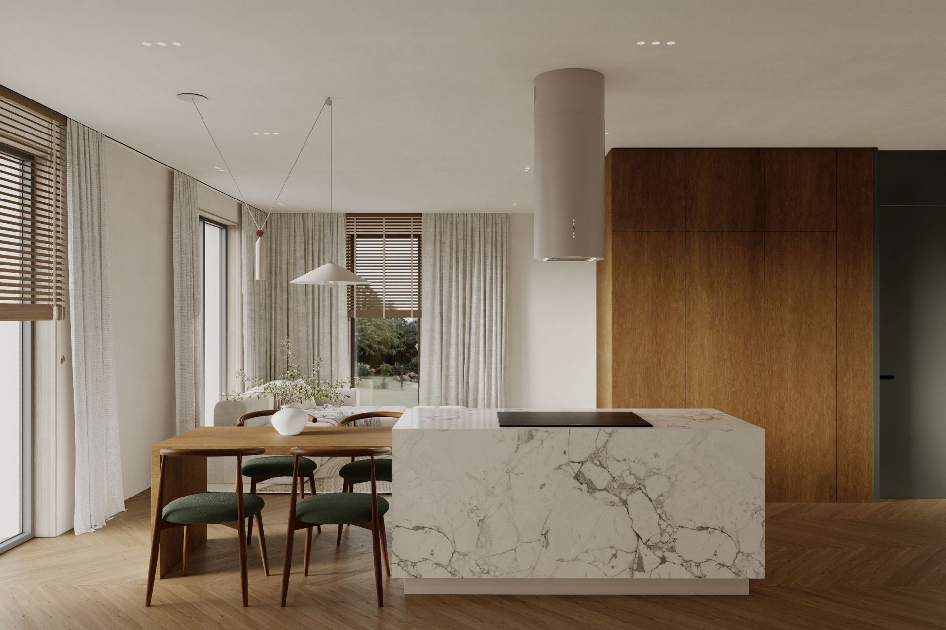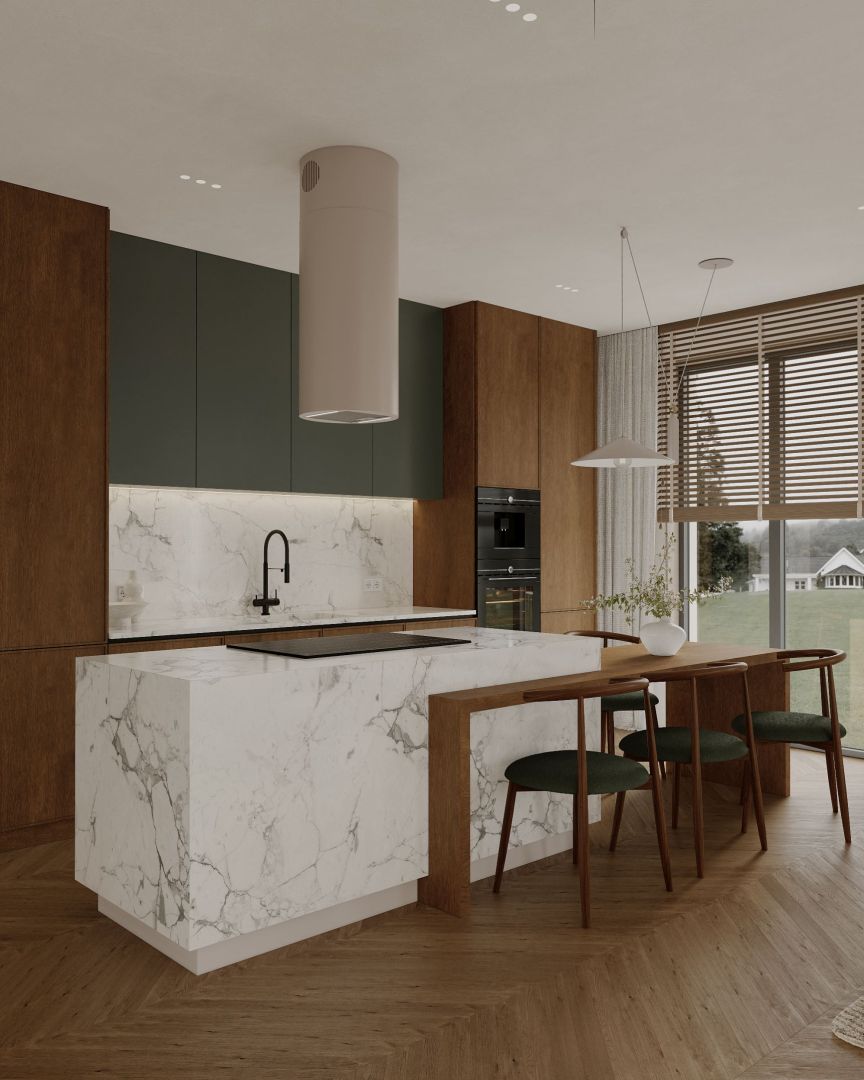,,Ostrůvková digestoř Cylindro 2Strips Kashmir přináší do kuchyně ticho a vizuální harmonii. Každý detail odráží řemeslné mistrovství značky Nortberg a dodává prostoru elegantní dojem."