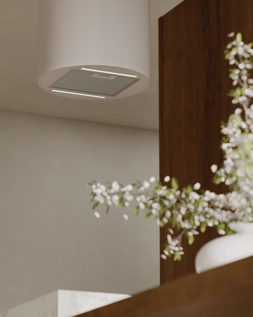 Objevte Cylindro 2Strips Kashmir – ostrůvkovou digestoř, která propojuje ticho, světlo a precizní design.