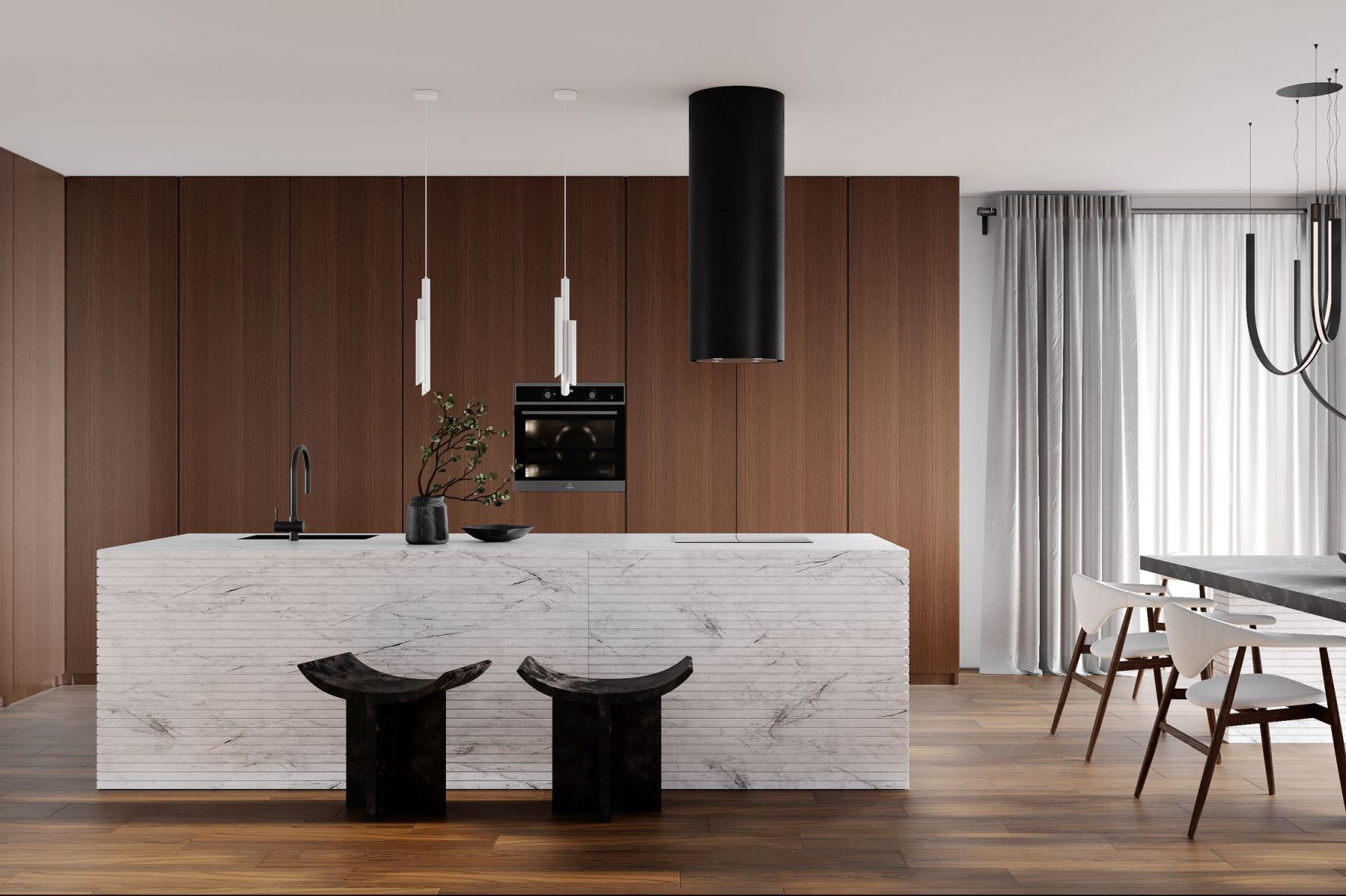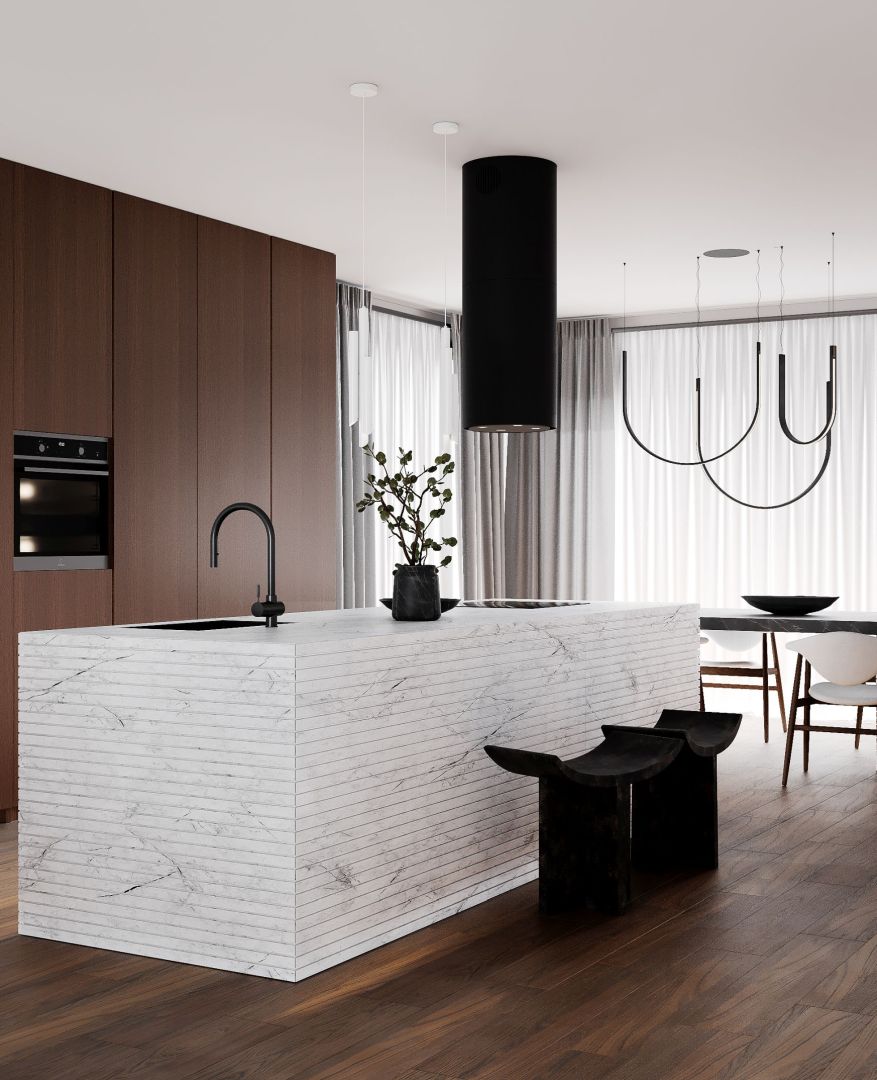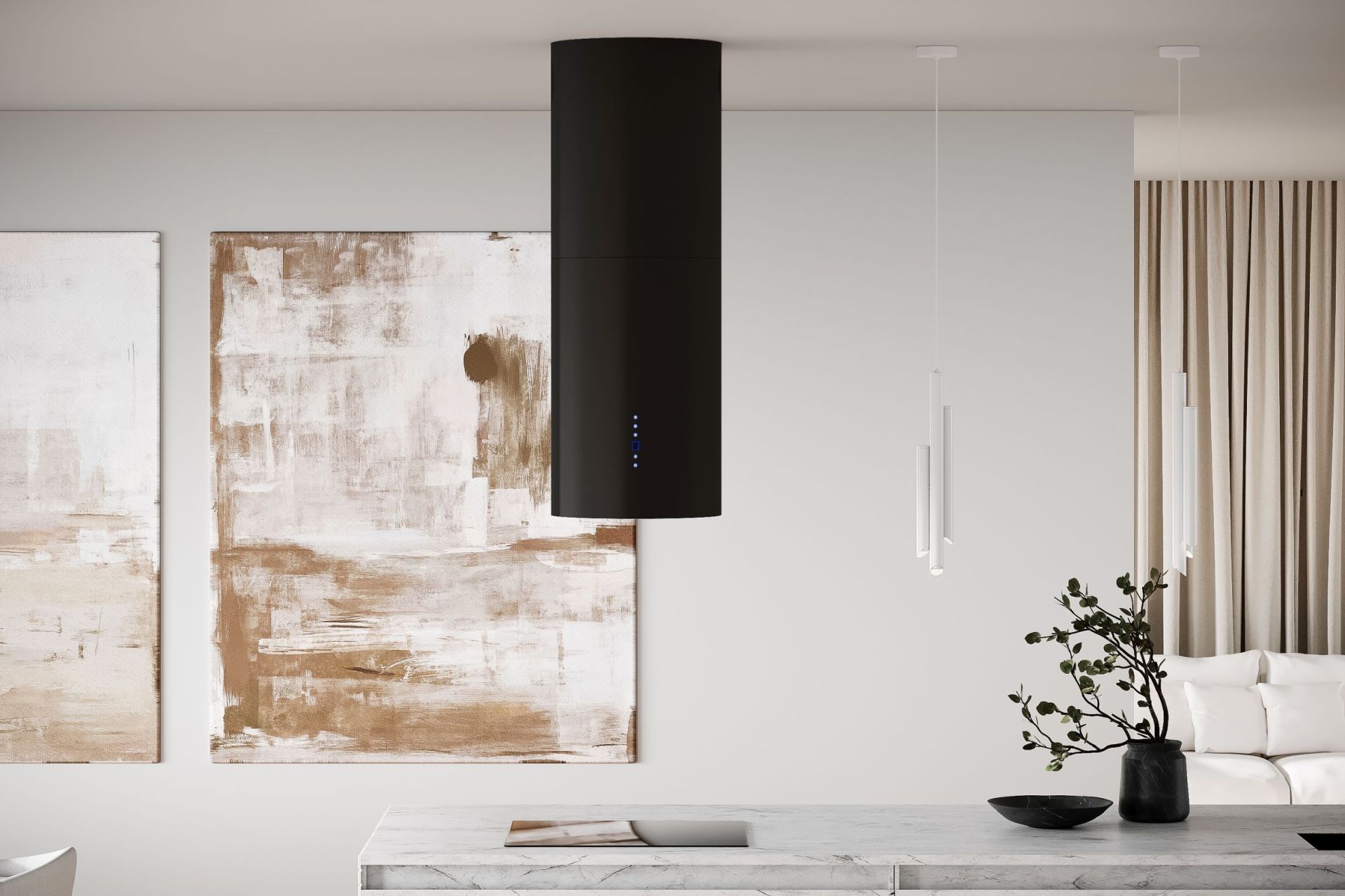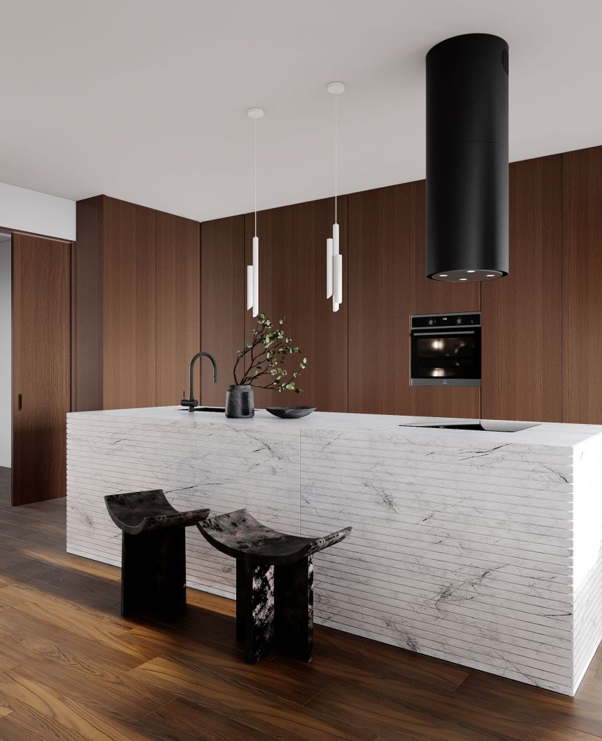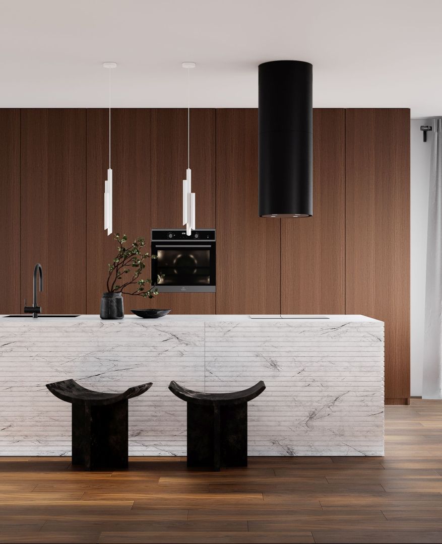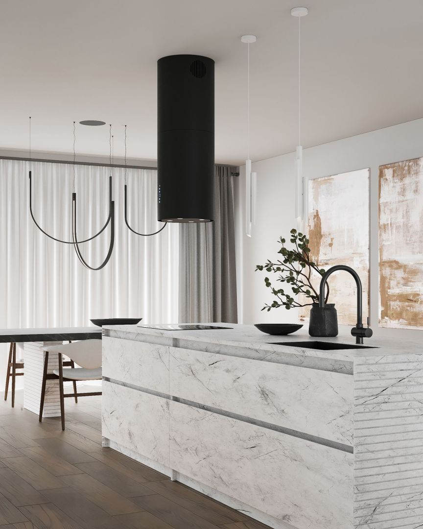 Ostrůvková digestoř Tubo Black Matt – elegantní kombinace matné černé a tvrzeného skla, 850 m³/h, LED osvětlení a snadná údržba.