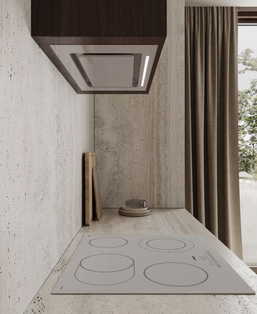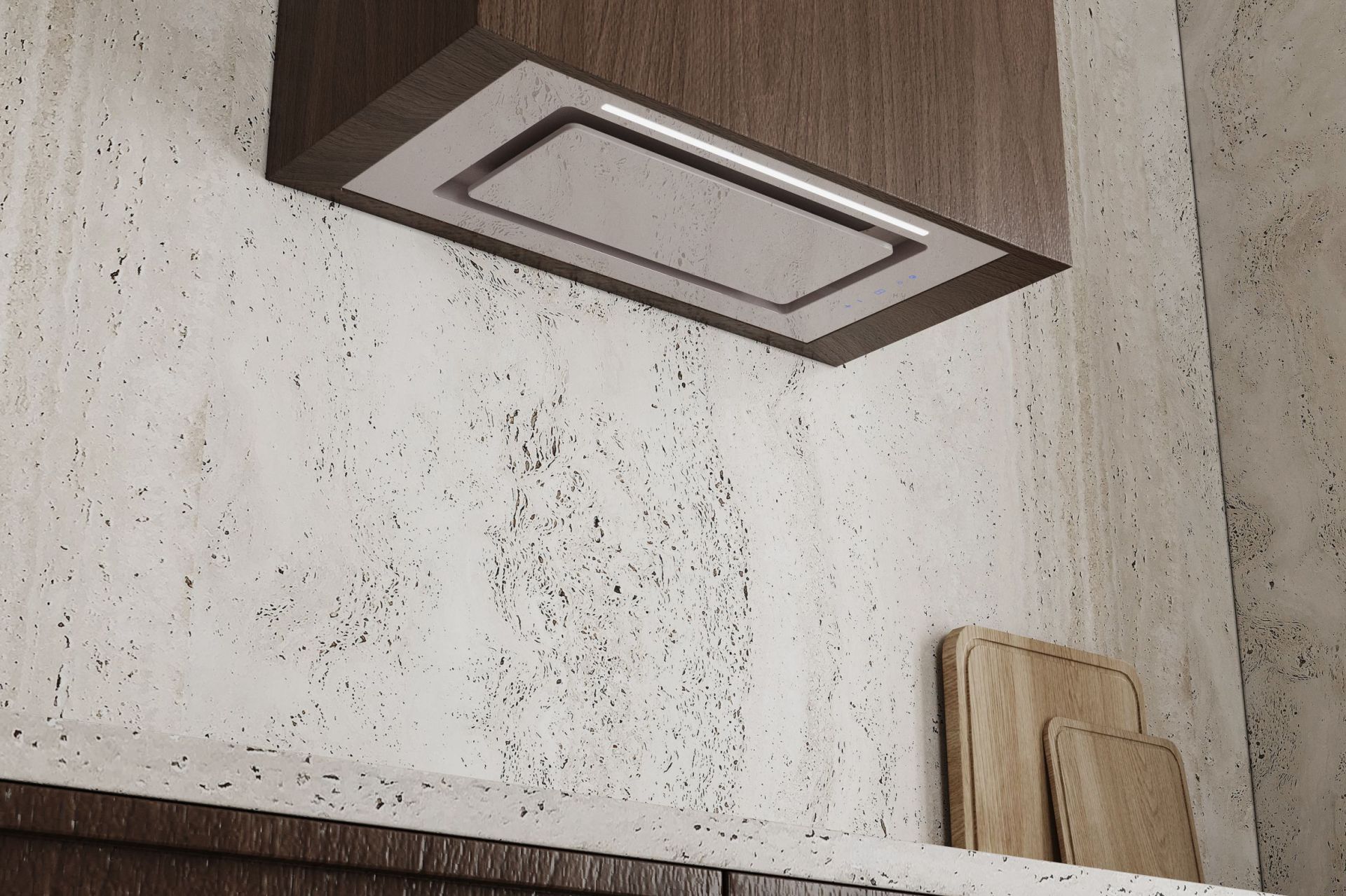 Spodní strana digestoře je vyrobena z hygienického a bezpečného tvrzeného skla, který koresponduje se spodní stranou skříňky. Skleněný povrch se navíc snadno čistí. Stříška absorbuje štěrbinou po celém obvodu digestoře. Podsvícený dotykový ovládací panel je skrytý za sklem. Sklo lze vyklopi a za ním je umístěn kovový tukový filtr a v režimu recirkulace pak i uhlíkový filtr (volitelné příslušentství).