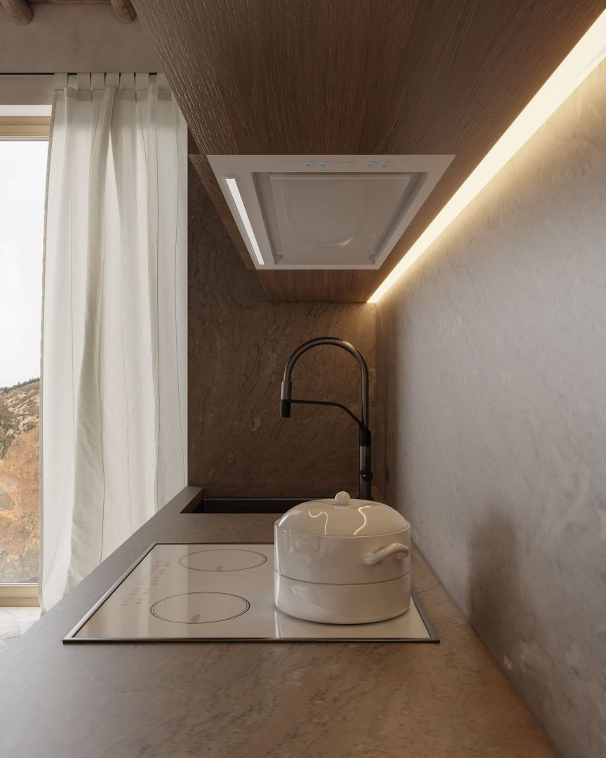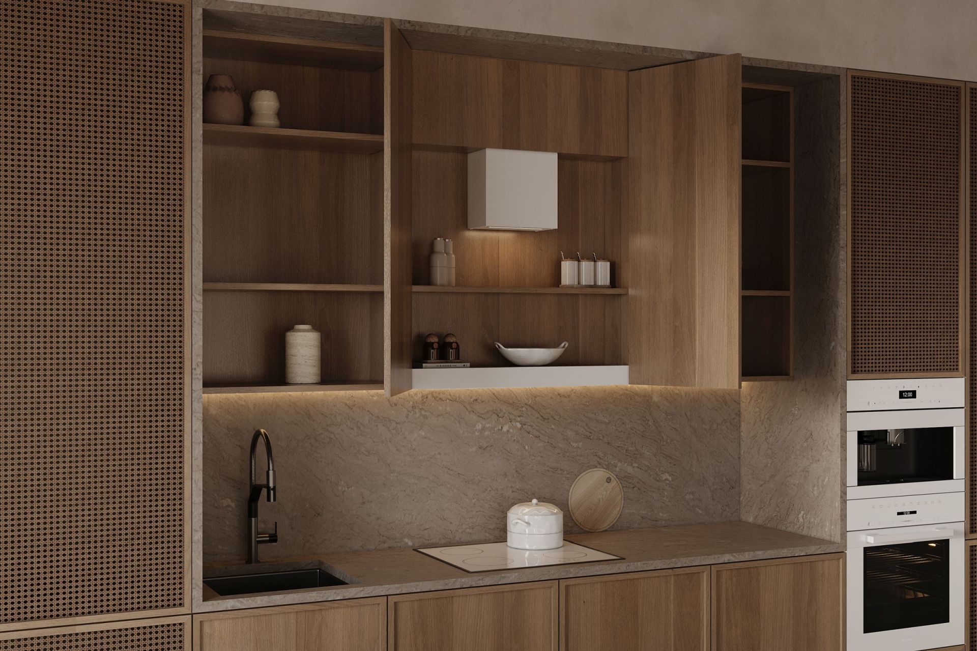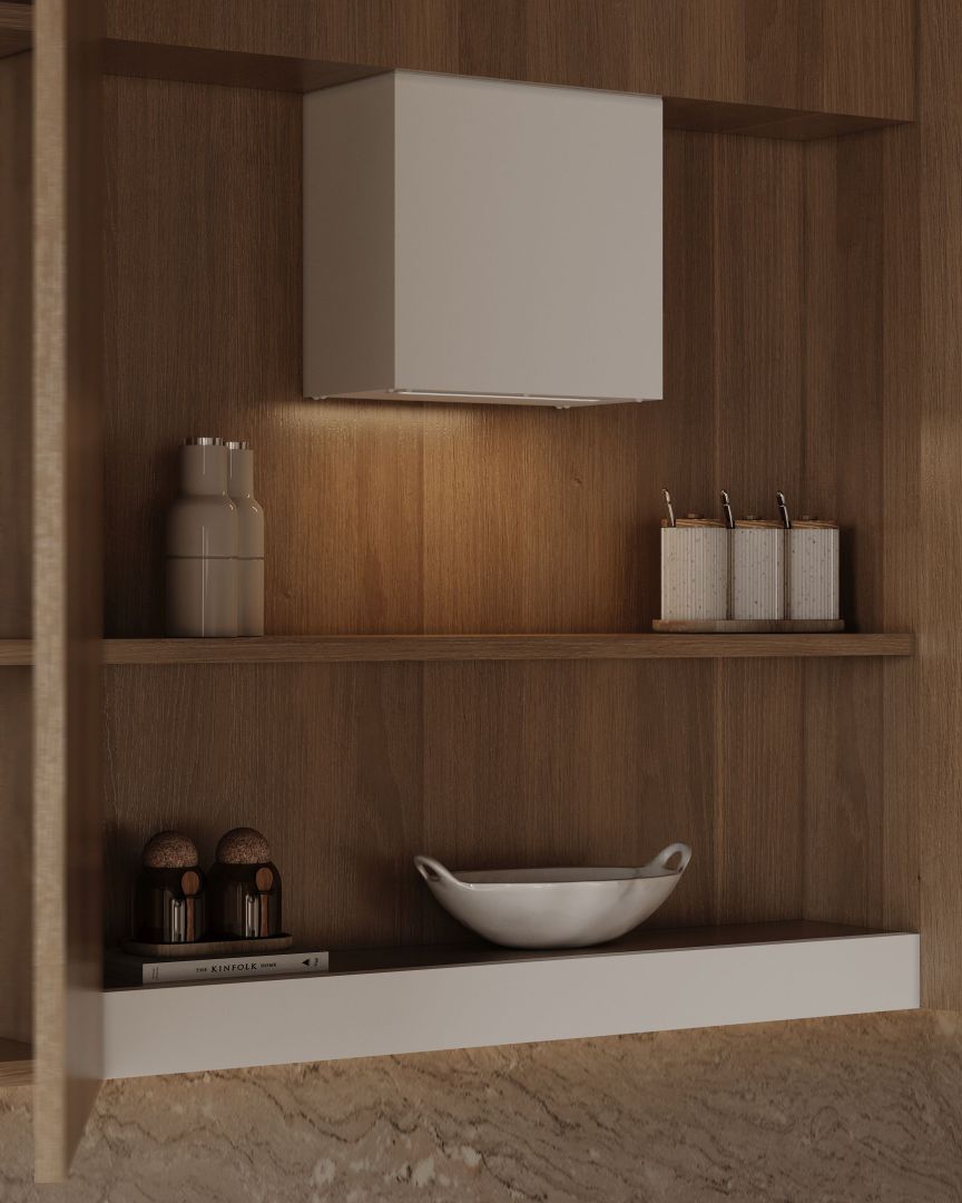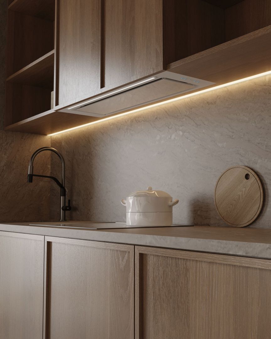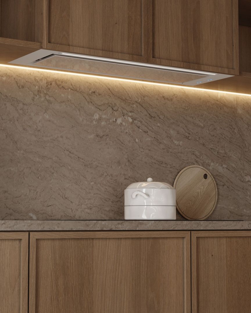 Nový vzhled vestavné digestoře! Navržena pro ty, kteří oceňují funkční využití kuchyňského prostoru. Skrytá ve skříňce jako klasická vestavná digestoř, místo turbíny připevněné k tělu je vybavena plochým ventilačním kanálem skrytým mřížkou. Díky tomuto řešení mají truhláři možnost přizpůsobit interiér skříňky přesně podle přání zákazníka.