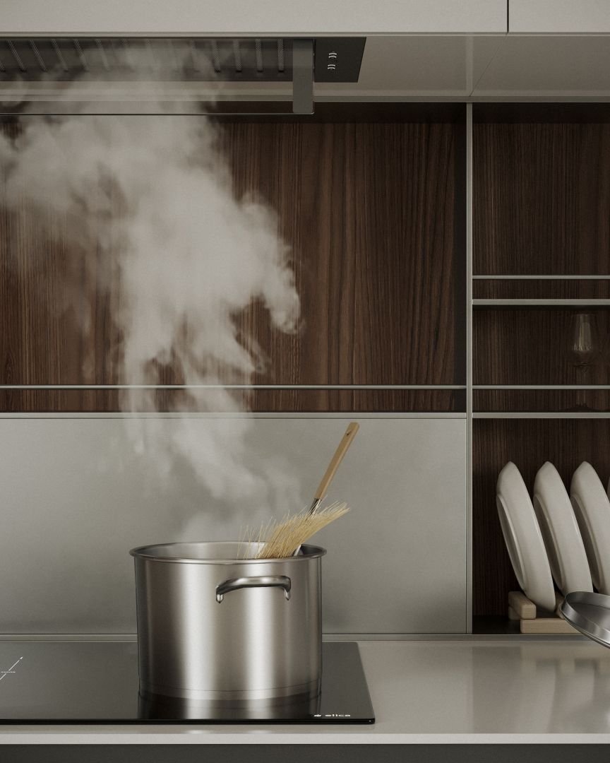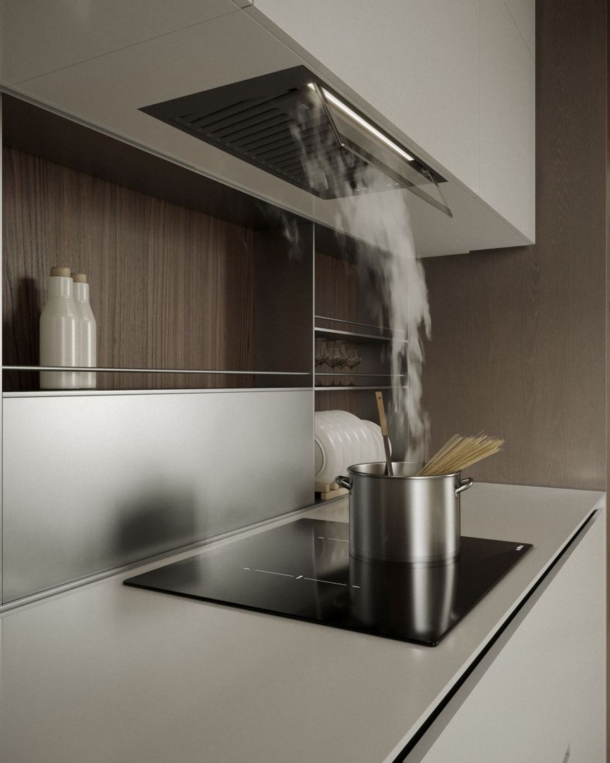 Na čelní straně digestoře se nachází skleněná výklopná klapka, která při otevření automaticky aktivuje LED osvětlení v teplotě 4000 K. Neutrální světlo, blízké dennímu, perfektně nasvítí varnou plochu a zvýší komfort při večerním vaření. Skleněná klapka nejen přidává na eleganci, ale zároveň účinně směruje páry dovnitř digestoře, čímž zvyšuje účinnost odsávání.